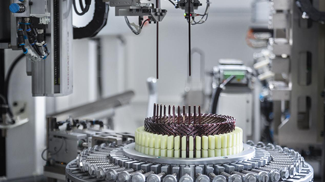 全自動插線機(jī)具備可編程整體式線杯編繞功能,兼容任意繞線設(shè)計,包括線杯組合、線杯梳理、整體搬運和壓裝功能模塊,解決線杯組合過程中的層間跳線組裝、線腳凌亂難入鐵芯、壓裝過程線腳變型等難題,為高層扁線電機(jī)的復(fù)雜繞線設(shè)計提供領(lǐng)先行業(yè)的插線解決方案。